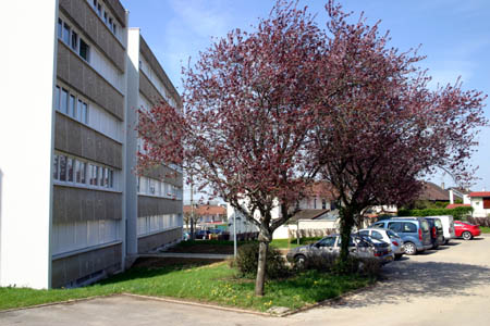 L'arrière du bâtiment avec son parking et une entrée accessible aux personnes à mobilité réduite. | |||||